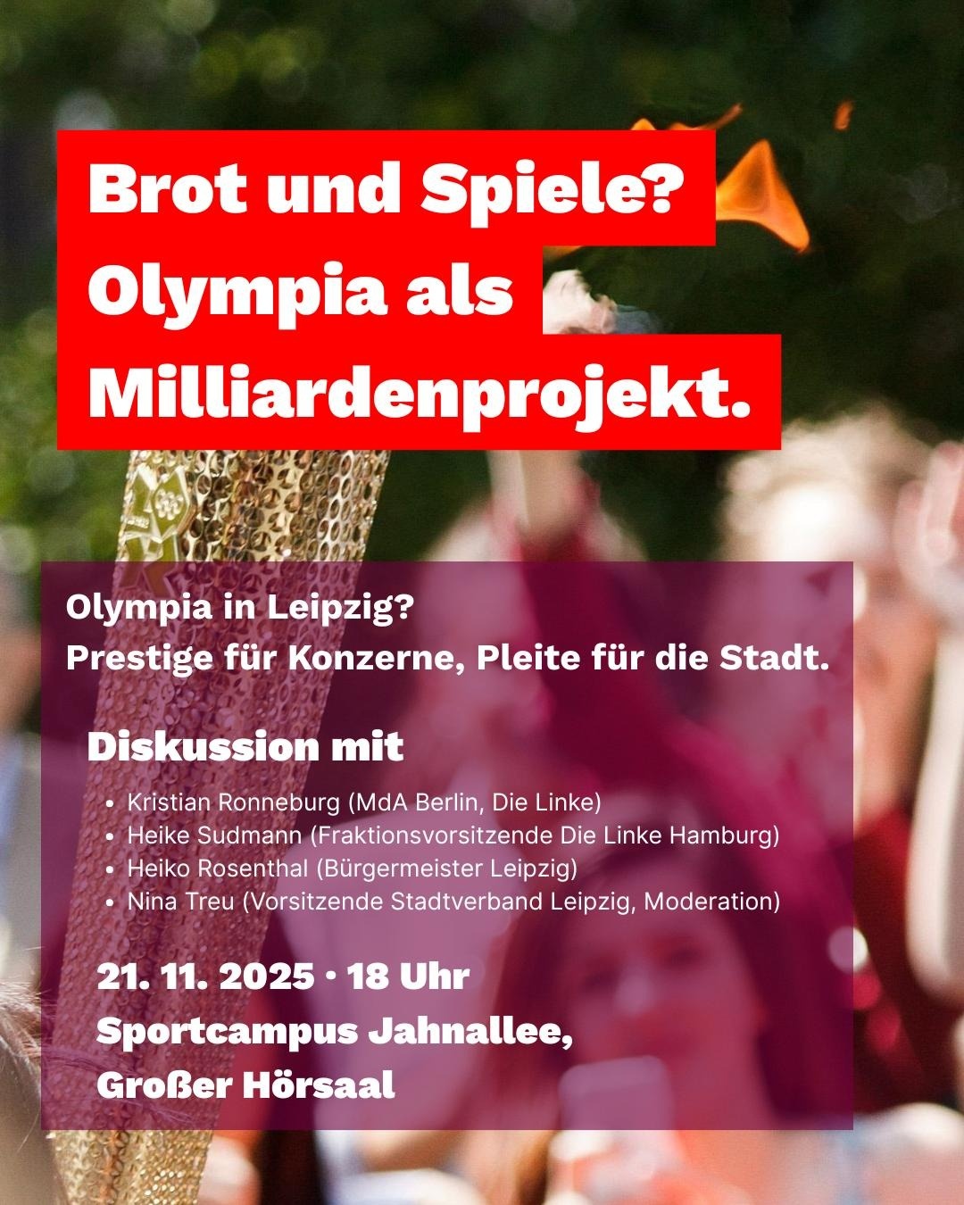 Wir wollen uns einen Überblick verschaffen und linke Positionen zur Olympiabewerbung diskutieren: Zwischen urbanen sozialen Aspekten, besonders der Wohnungssituation in den betroffenen Städten, NOlympia, den (ausverkauften) olympischen Gedanken und ganz pragmatischen Erwägungen, was das für Leipzig bedeutet.