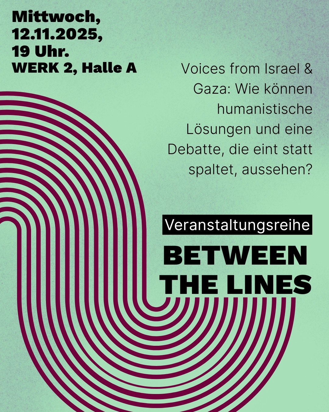 Im Mittelpunkt der Veranstaltung, die Auftakt der Reihe "between the lines" ist, stehen die Perspektiven von zwei Menschen aus Gaza und Israel. Wir wollen ihre persönlichen Geschichten, Erfahrungen und Sichtweisen hörbar machen. Gemeinsam setzen sie sich für Frieden und gegenseitiges Verständnis ein – jenseits von politischen Fronten.